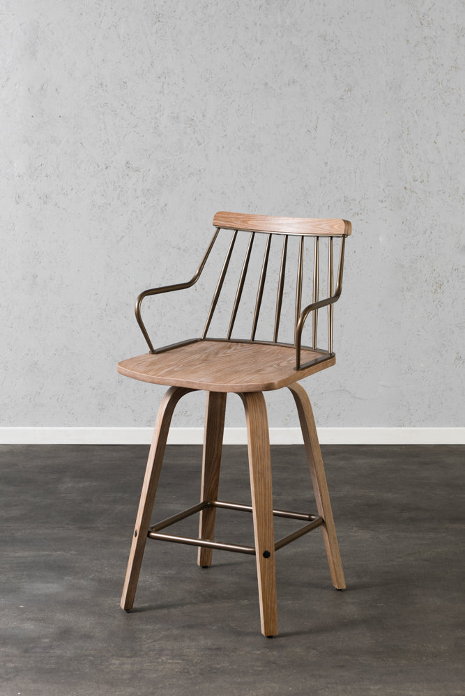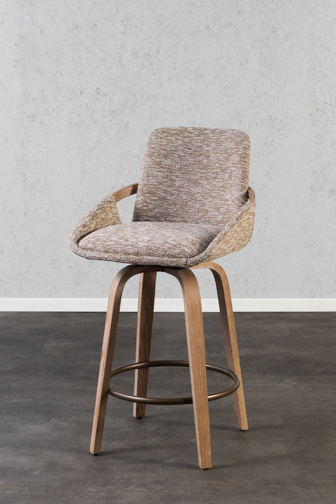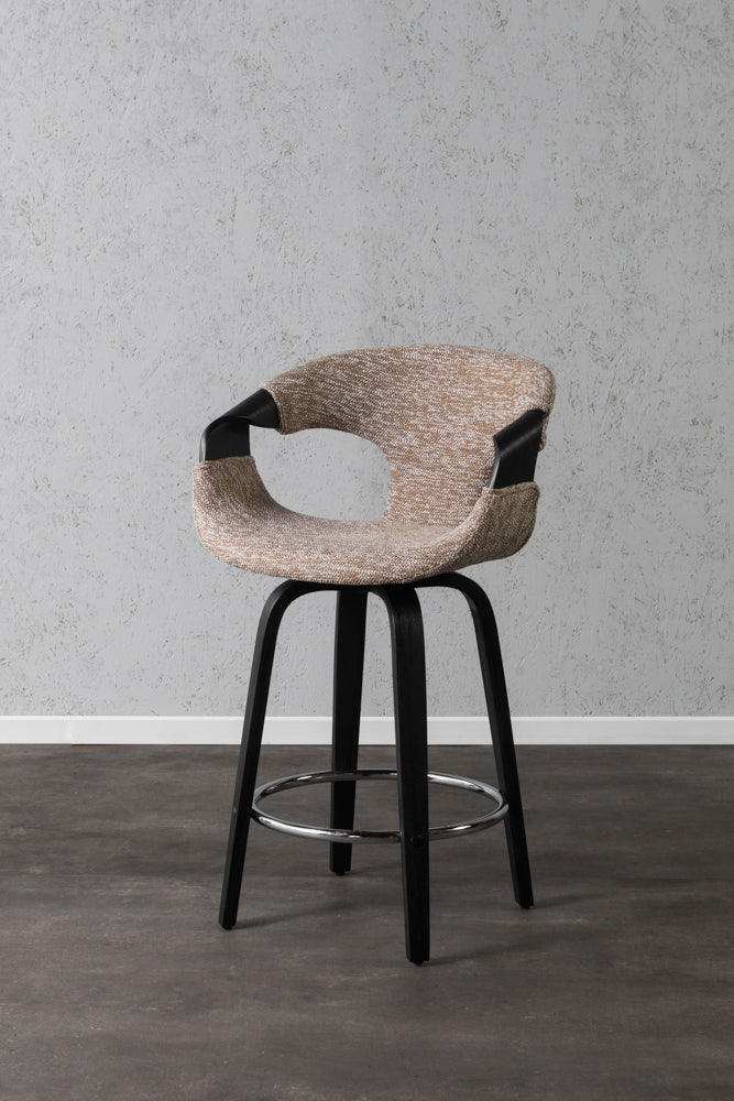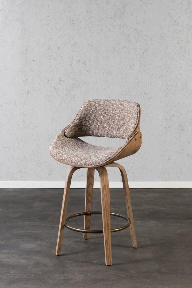 כיסא בר מעץ מלא בשילוב ריפוד בד חום בעל משענת נמוכה