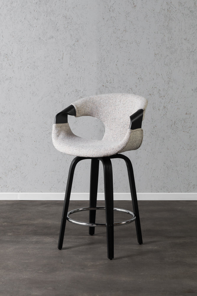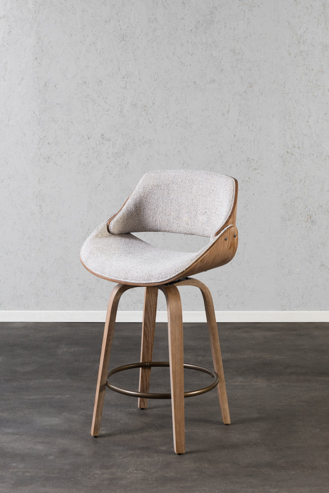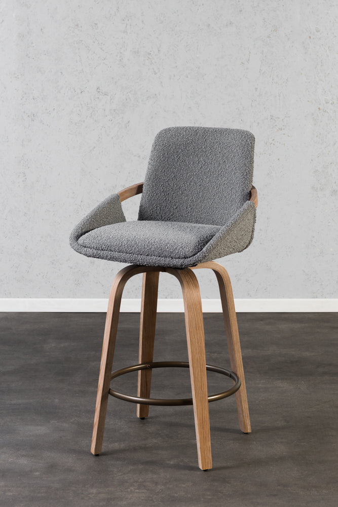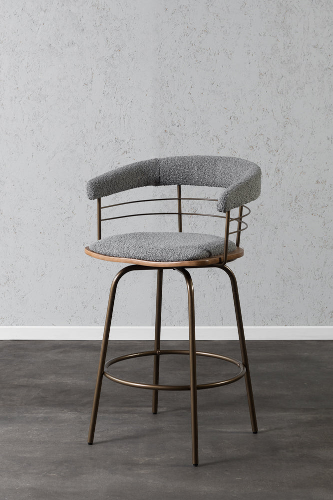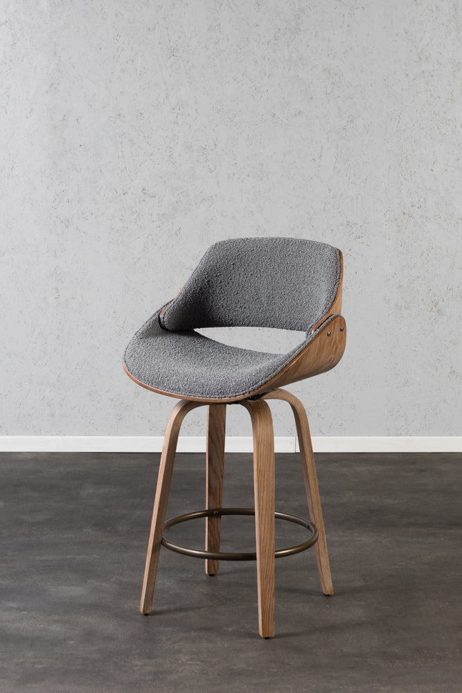 כיסא בר מעץ מלא בשילוב ריפוד בד אפור בוקלה בעל משענת נמוכה