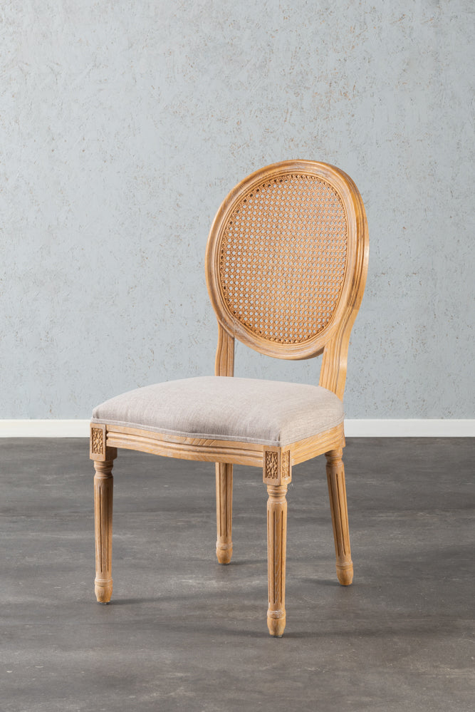 כיסא מעץ מלא משענת עגולה ראטן- בד בהיר