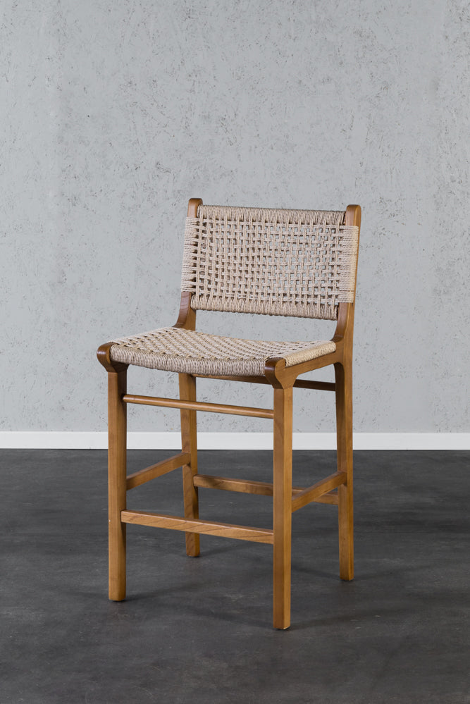 כיסא בר חבלים מעץ מלא גוון עץ טבעי