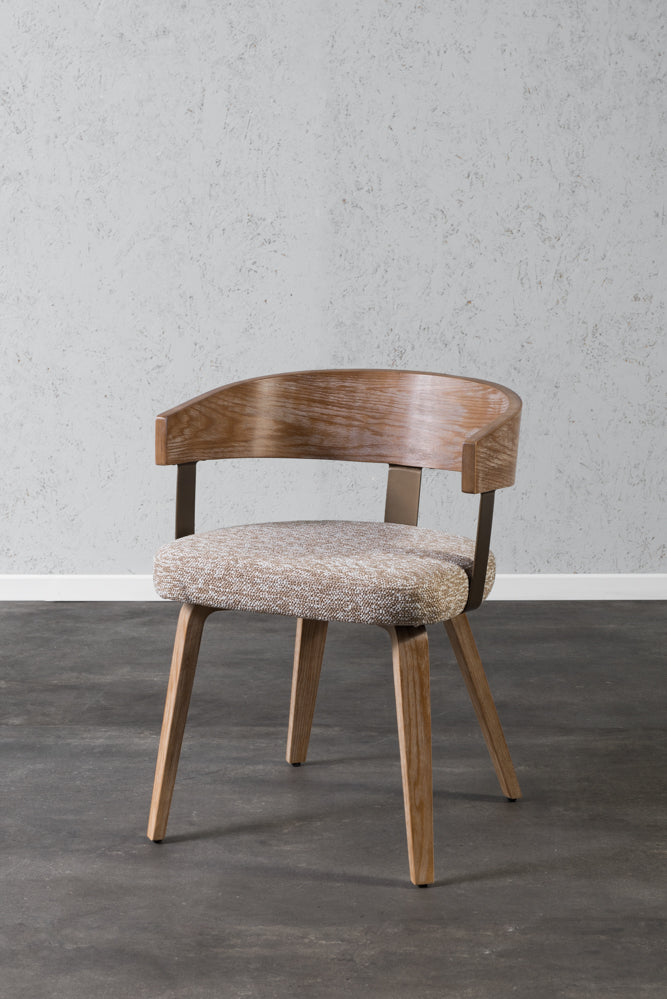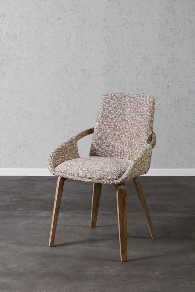 כיסא מרופד בד חום ידיות עץ עם חיבור מתכת