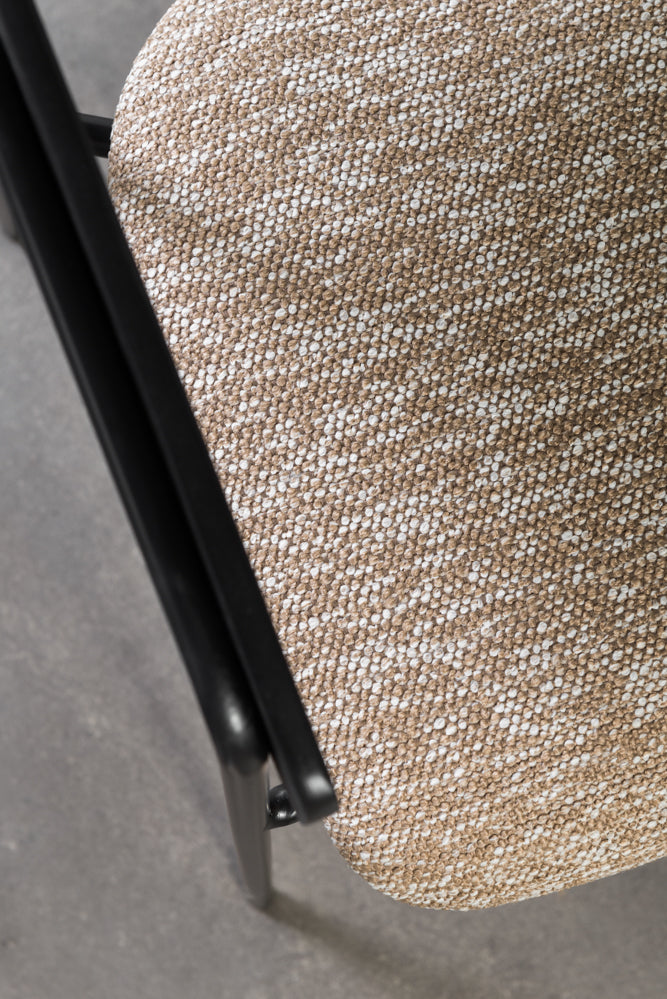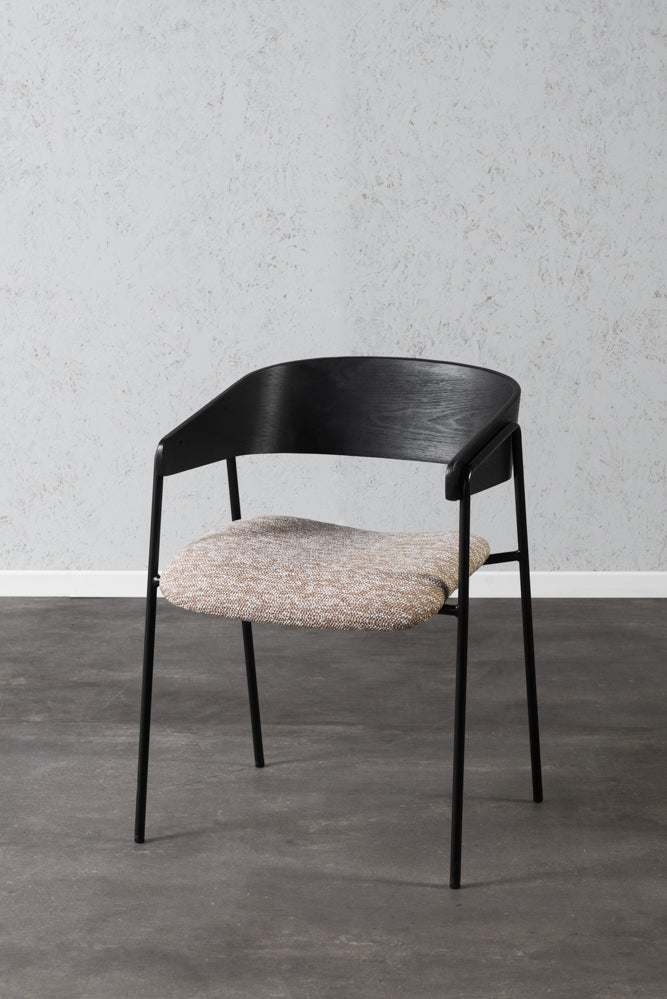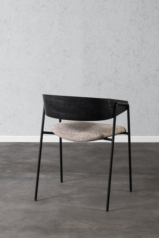 כיסא מרופד בד חום בעל משענת עץ שחורה ורגליים דקות