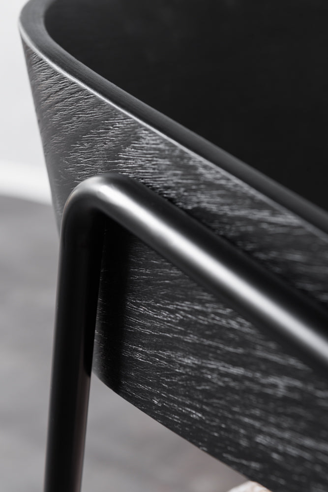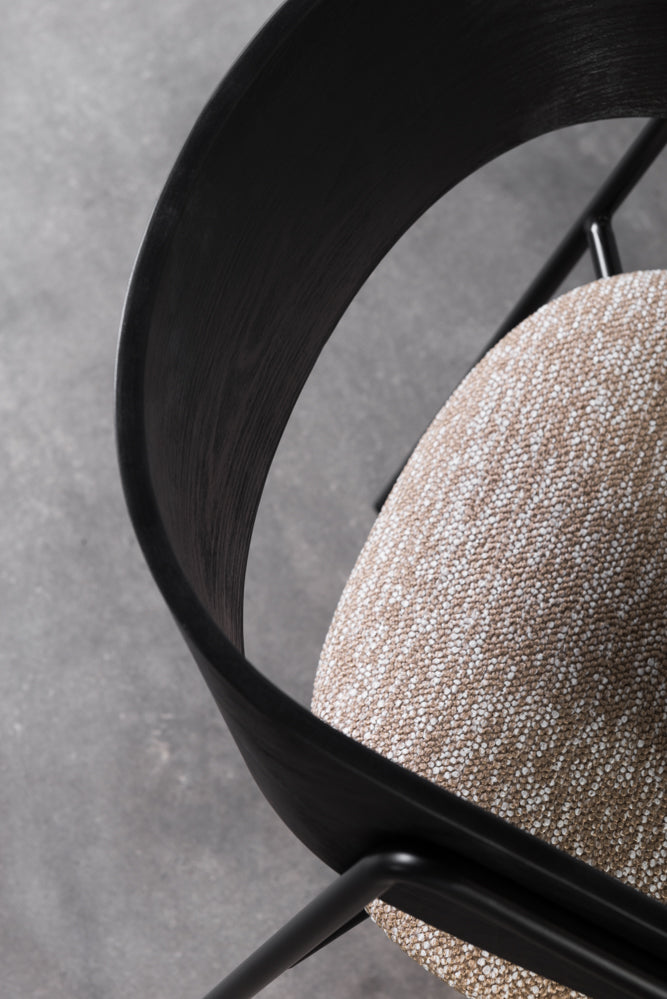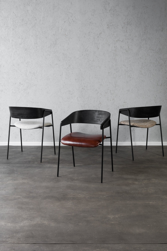 הכיסא מתאפיין במשענת עץ מעוגלת המשלבת עיצוב נקי ומרשים עם ידיות ורגלי מתכת דקות ויציבות שמוסיפות לו קלילות ואלגנטיות.