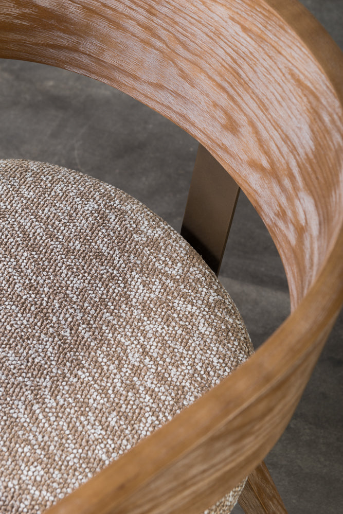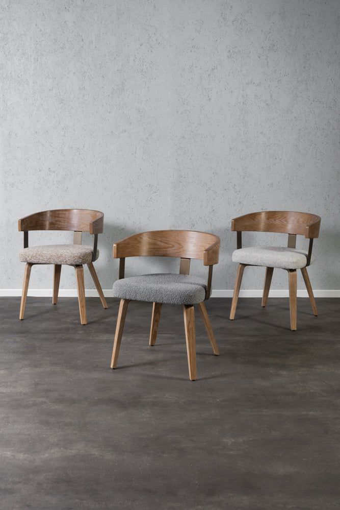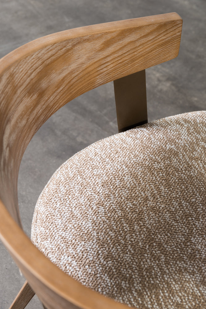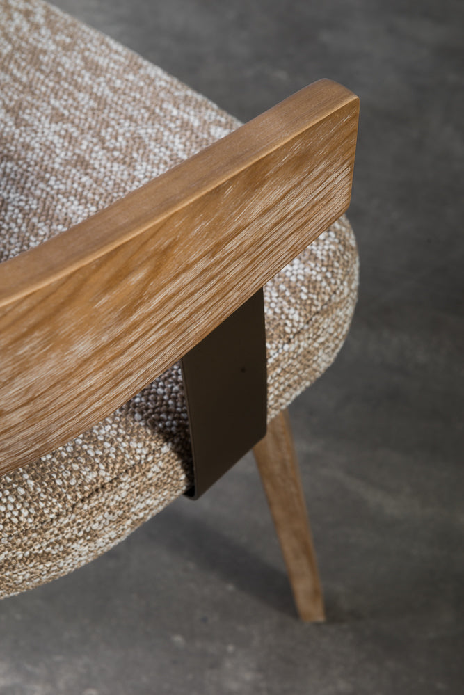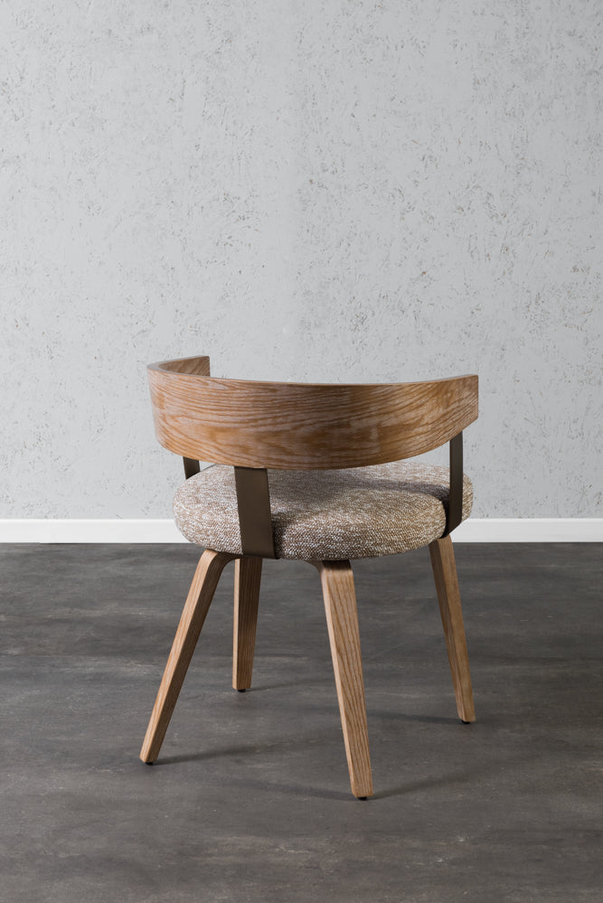 כיסא מרופד בד חום משענת עץ ידיות מוטות מתכת