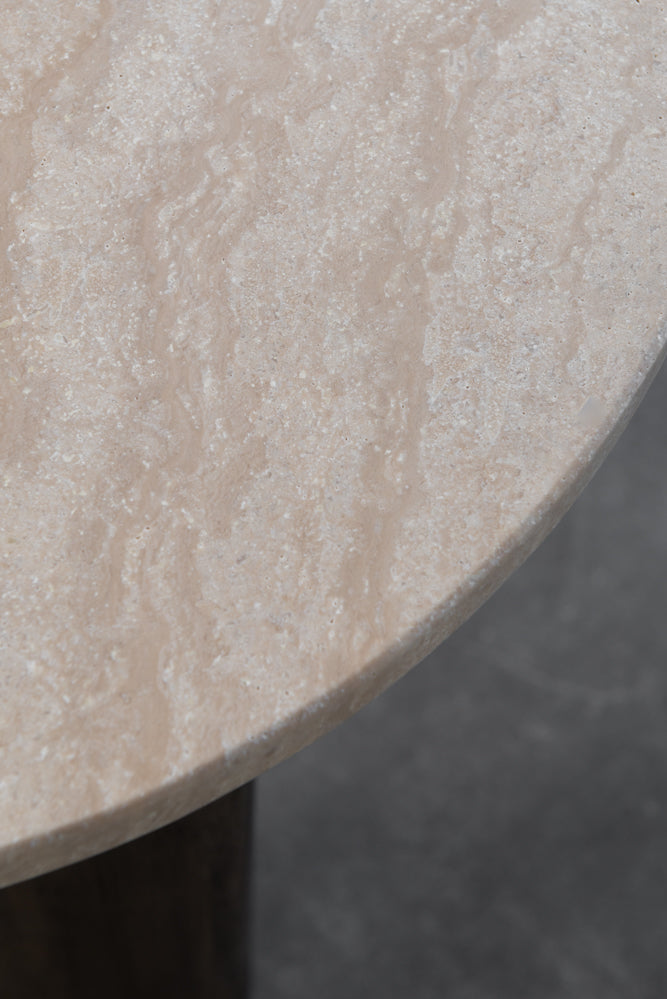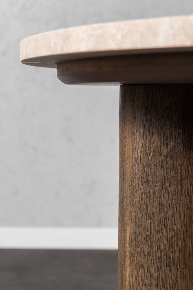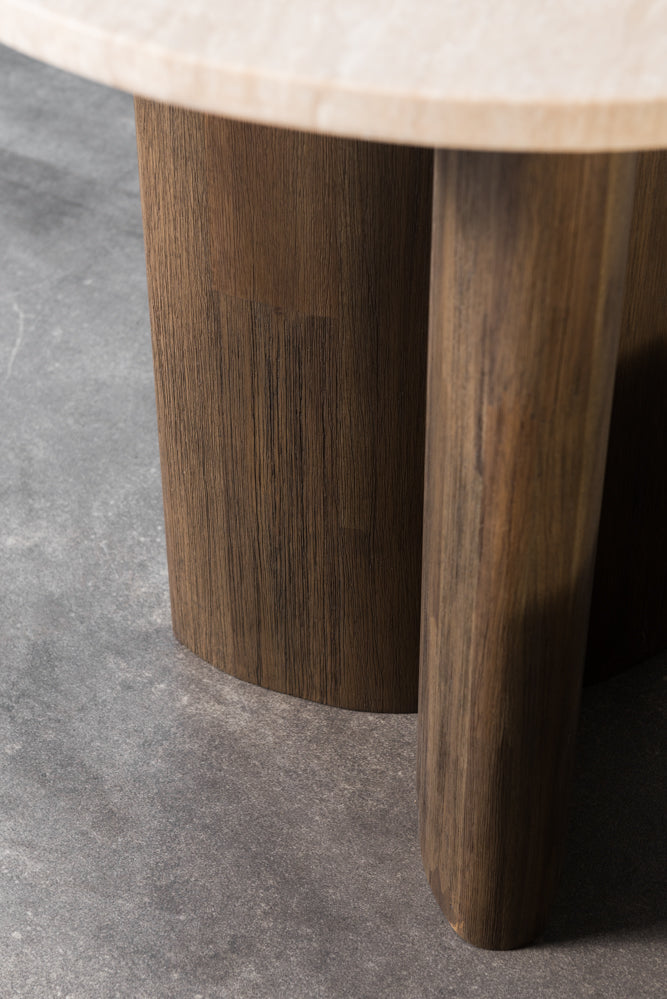 רהיט עוצמתי מעץ מלא מסוג אקציה, עם עיצוב מרשים שמשלב בין טבעיות לאלגנטיות. החלק העליון עשוי שיש טרוורטין יוקרתי בגימור מושלם, המעניק מראה ייחודי ואלגנטי לחלל.
