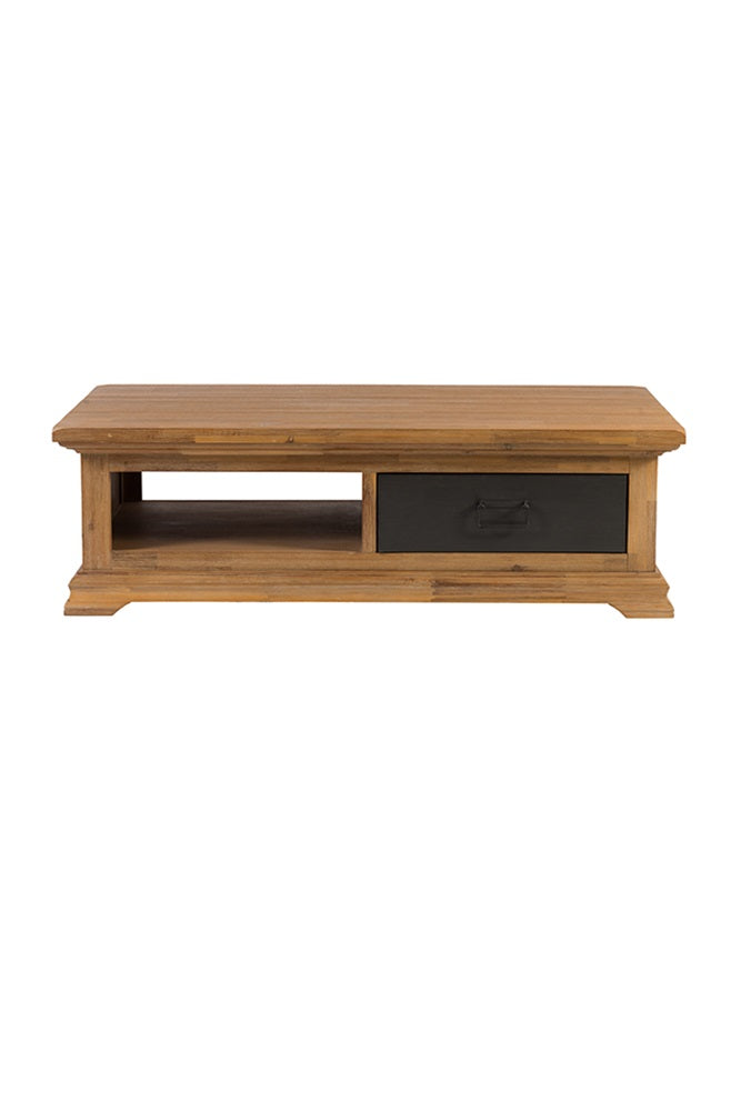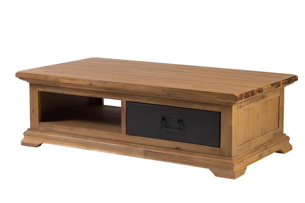 שולחן סלון העשויה מעץ מלא מסוג אקאציה עם מינימום נגיעה של צבע, דבר היוצר מראה כפרי וחם.