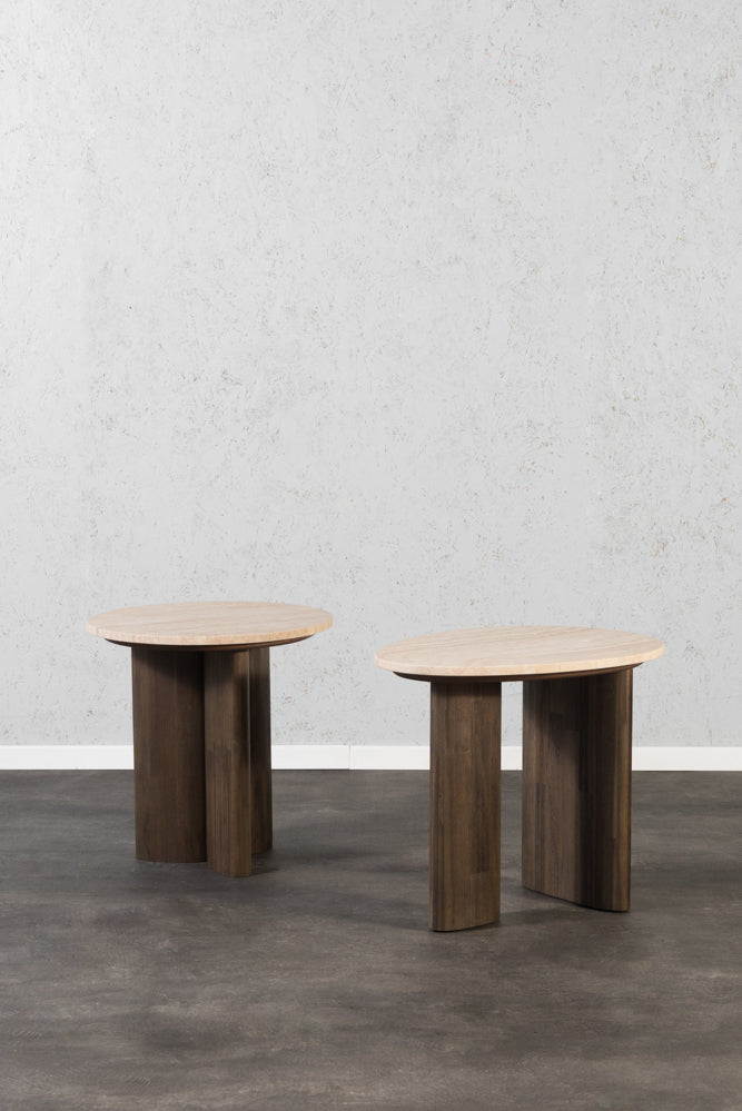 שולחן צד אובלי מעץ ושיש מקולקציית טרוורטין
