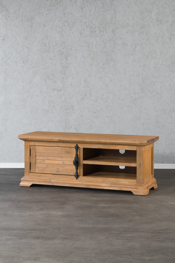 שידת טלוויזיה העשויה מעץ מלא מסוג אקאציה עם מינימום נגיעה של צבע, דבר היוצר מראה כפרי וחם.