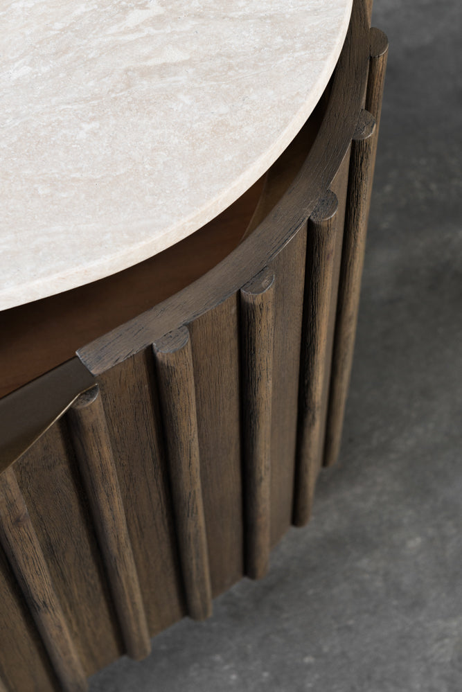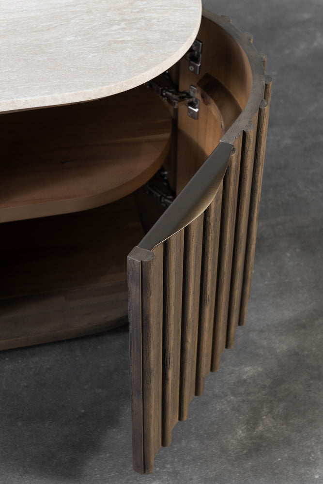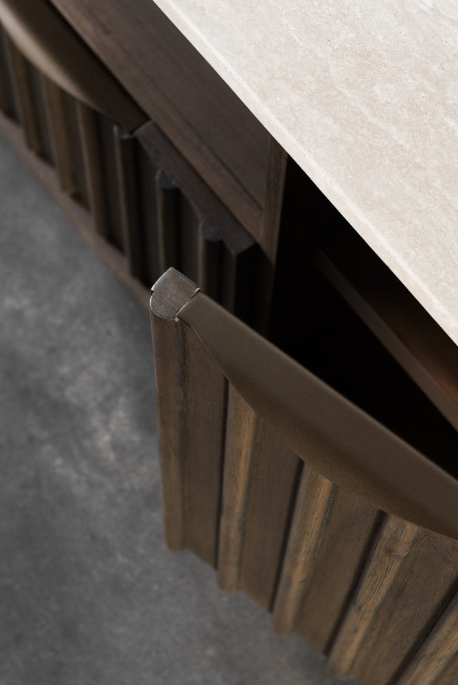 רהיט עוצמתי מעץ מלא מסוג אקציה, עם עיצוב מרשים שמשלב בין טבעיות לאלגנטיות. החלק העליון עשוי שיש טרוורטין יוקרתי בגימור מושלם, המעניק מראה ייחודי ואלגנטי לחלל.