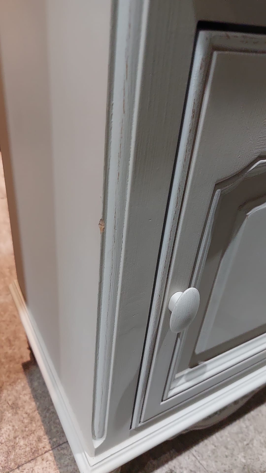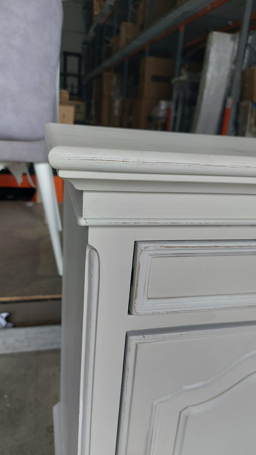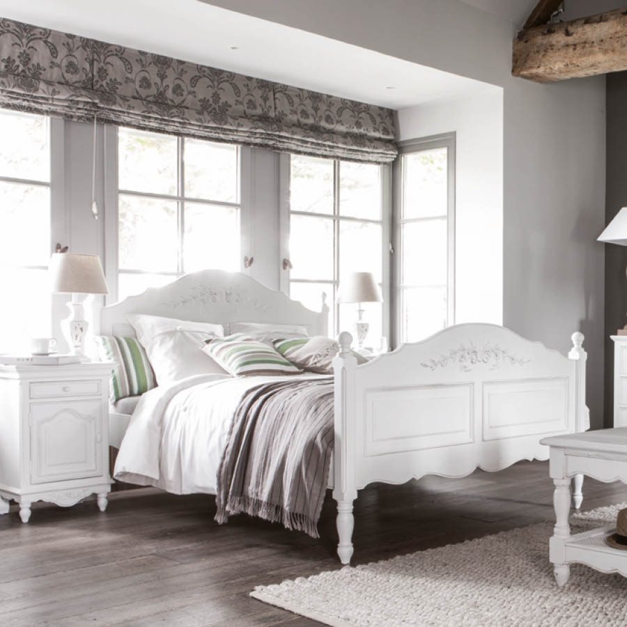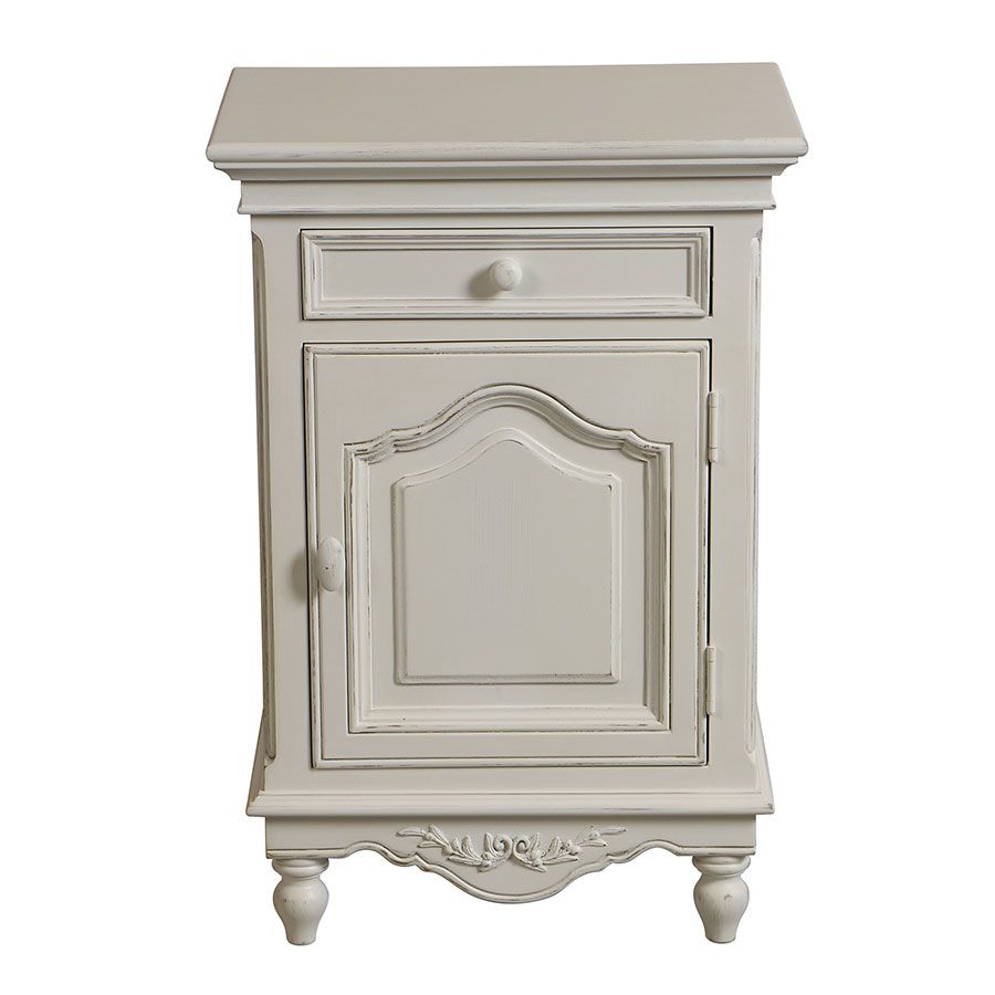 שידת לילה מעץ בגוון לבן משופשף המעניקה מראה מיושן וכפרי לחלל החדר.